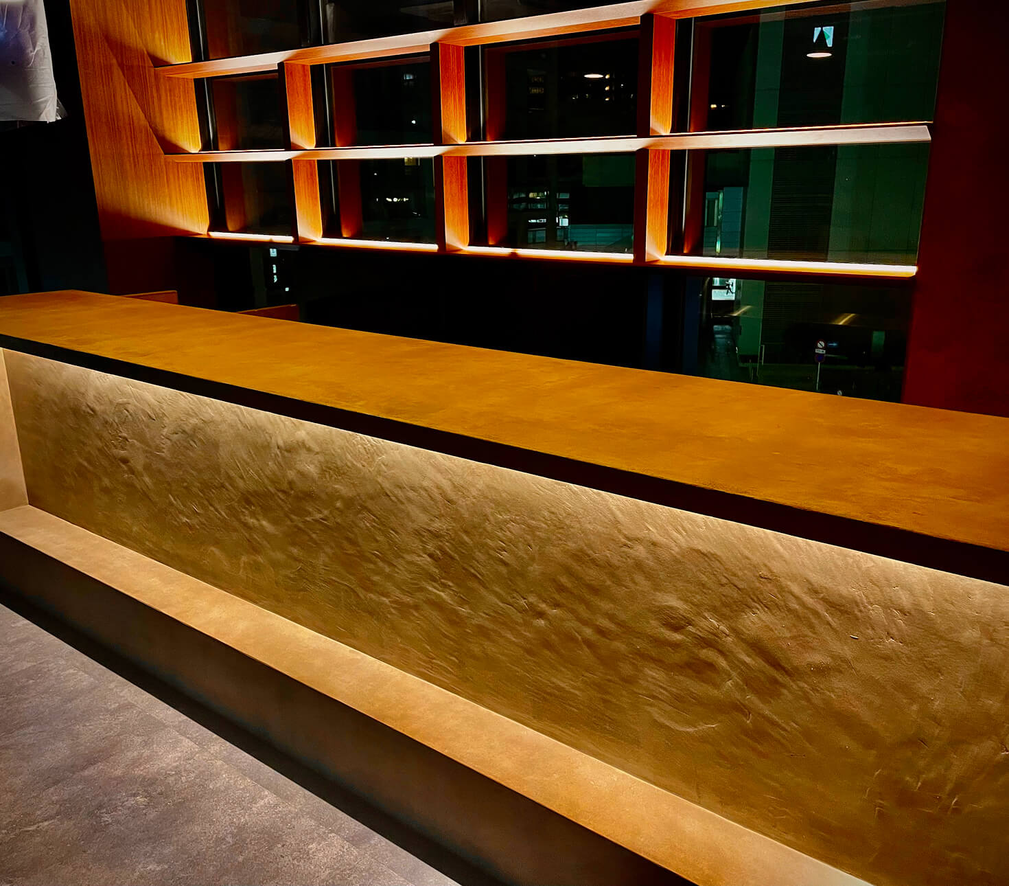 モルタルのイメージを超えた“多彩な質感”を左官職人の技術で自在に表現でき、自由な発想が、ステキな個性を導き出します。壁をはじめとする天井・床はもちろんの事、今までその発想も無かった、家具への仕上げ材としても最適です。